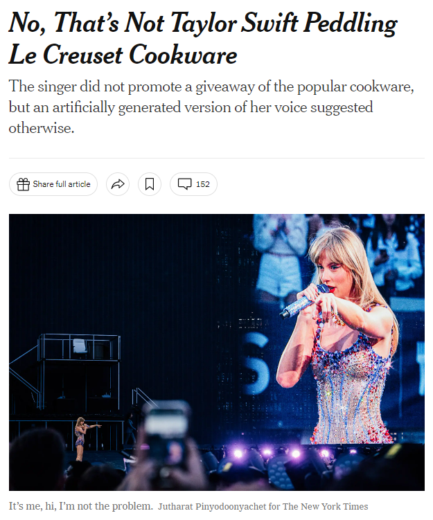 So, it’s worrisome when you see an ad using an AI-generated likeness of Taylor Swift’s voice selling Le Creusset cookware and then, inside the same week, have Tom Hanks, the journalist Gayle King and the YouTube personality MrBeast all saying that A.I. versions of themselves had been used, without permission, for deceptive dental plan promotions, iPhone giveaway offers and other ads.